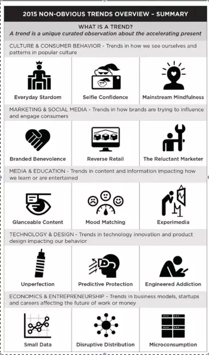 他的新书《非显而易见》,应该暂时还没有中文版,是关于如何从趋势中规划战略的。在书中,他先告诉读者怎样得到有关“趋势”的推测,然后提到他分成5类的15个2015年的趋势推论,我在这里跟大家分享。