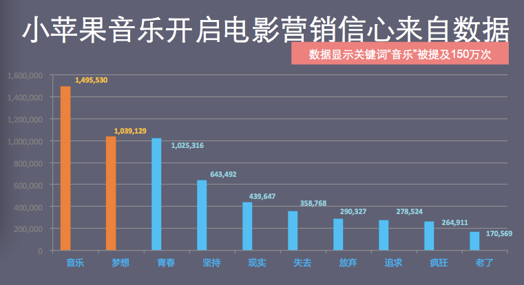所有数据中,提到“音乐”的有1495530次,第二位“梦想”1039129次,第三位“青春”1025316次。所以,我们确定了要再次以一歌作为宣传主线爆点的战略,《小苹果》由此被选中。
